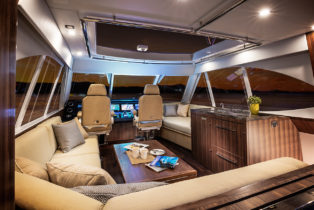 Spacious Opulent Saloon – Rich textures, high-gloss finishes, subtle use of lighting and state-of-the-art technology deliver a special boating package. Appointments and usable space are aplenty, and of the highest quality.