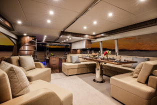 Flybridge Penthouse – The view and the specification are sublime. Features include forward helm, sun roof, air-conditioning, aft helm station, wet bar, Pompanette helm chairs, and inside and outside lounges.