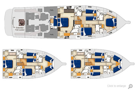 The 77 Enclosed Flybridge is a design collaboration between world-renowned designer Frank Mulder and Riviera’s own in-house design team. The 77’s immense volume allows for a four cabin, four bathroom layout. The master stateroom is king-size, the VIP stateroom forward is queen-size and the guest cabins, port and starboard, are twin-berth with a third pull-down Pullman-style berth.